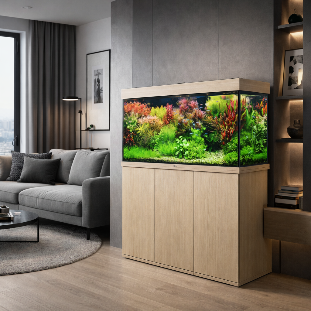 Мы подбираем оборудование, декор и оформление заранее, поэтому вам не нужно отдельно искать фильтры, освещение, грунт или рыб — всё уже подобрано и настроено специалистами. Прямоугольная форма аквариума идеально подходит для создания крупных и детализированных подводных композиций. Такой аквариум гармонично смотрится в просторных современных интерьерах и становится заметным элементом пространства. Аквариум устанавливается на усиленную тумбу, рассчитанную на большой объём воды и оборудование. Все технические элементы скрыты внутри, благодаря чему система выглядит аккуратно и воспринимается как полноценный дизайнерский объект.